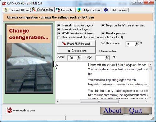 You can't simply open PDF files in Word and edit them... Wrong! PDF 2 HTML can open PDF files. It recognizes the texts, the layout and many graphics. Then you can save this as HTML, RTF or TXT file. You can open these files in Word or Frontpage etc. So you are ready to upload your documents to the internet. And anybody can view HTML files instantly. You can create text versions of you PDF documents and use the Windows search functions to find text in all your PDF documents. All information are immediately available and searchable! Visually impaired people are able to get the information with screen readers if you support them with html or text only versions of your documents!