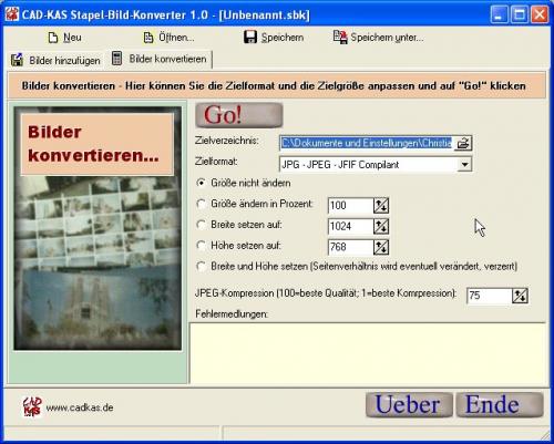 Mit dem Programm können Sie hunderte Bilder mit einem Mausklick in ein anderes Bildformat konvertieren und dabei auch noch auf Wunsch die Größe der Bilder anpassen. Es werden alle gängigen Bildformate z.B. fürs Internet unterstützt. Oft müssen Sie Bilder fürs Internet ins JPG oder GIF Format konvertieren und dabei wollen Sie die Bildgröße angepassen. Mit dem Programm können Sie die neue Bildgröße Prozentual im Verhältnis zur alten Größe angeben oder Sie können eine neue Breite und/oder Höhe für alle Zielbilder definieren. Sie können also z.B. 200 Bilder fürs Internet in 500 Pixel Breite JPGs konvertieren und das alles auf Knopfdruck. Wenn eine größere Bildgröße angegeben wird, wird das neue Bild bei Speicherung als JPG interpoliert, so dass Sie die Qualität sich erhöht. Mit dem Programm können Sie also auch die Bildqualität von kleinen Internet-Bildern z.B. vor dem Ausdruck aufbessern.
