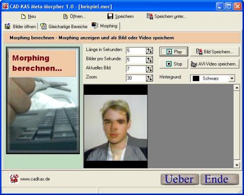 Meta-Morpher ist ein Morphing Programm, welches zwei Bilder schrittweise in einander umwandelt. Z.B. ein Gesicht in ein anderes. Die Möglichkeiten sind zahlreich. Sie können z.B. Tiergesichter in Menschengesichter umwandeln und umgedreht. Es können dabei beliebig viele Zwischenschritte berechnet werden. Sie müssen nur die zwei Bilder auswählen und die Bereiche im Bild markieren, die ähnlich sind und sich deshalb immer decken sollen, z.B. der Kopf, die Augen und der Mund. Das Ergebnis kann als Bild oder als Video gespeichert werden.