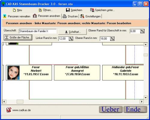 Sie müssen nur die Namen, die Geburts- und Sterbedaten und die Eltern aller Personen eingeben. Zusätzlich können Sie sogar einen Lebenslauf und ein Bild zu jeder Person speichern. Die Personen werden dann noch grafisch korrekt angeordnet. Jetzt können Sie Ihren persönlichen Stammbaum ganz einfach per Mausklick ausdrucken.