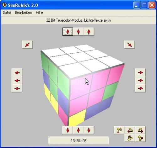 Um den Würfel herum sind Pfeile angeordnet, die jeweils eine Seite des Würfels um Ihren Mittelpunkt dreht. Sie können ausprobieren, was passiert, wenn Sie auf einen Pfeil klicken. In der unteren rechten Ecke, befinden sich 5 Buttons, die mehrere festgelegte Züge hintereinander ausführen. Diese Züge sind sehr nützliche Züge, da Sie einem viel Arbeit abnehmen können, nähere Informationen erhalten Sie weiter unten.