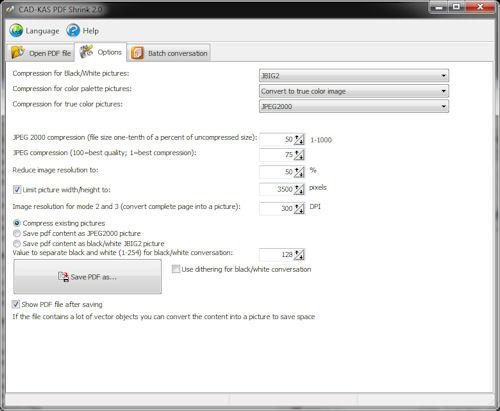 Are your pdf files to big? With PDF Shrink you have to ultimate tool to compress existing pdf files. The program compresses all pictures in the pdf file with the JPEG2000 (color pictures) or the JBIG2 (b/w pictures) compression. You can choose the resulting size for the JPEG2000 pictures. If your files does not contain big pictures but many line objects (CAD file) or many embedded fonts our program can help you too. In this case you have to option to save the complete content of one page as JPEG2000 or JBIG2 picture. You can choose the resolution which fits your needs. 300 DPI for printouts and 150 DPI for Internet for example. A complete page in b/w compressed with JBIG2 can be as small as 12 KB. The program can convert as much files as you want with one mouse click in the batch conversion mode.